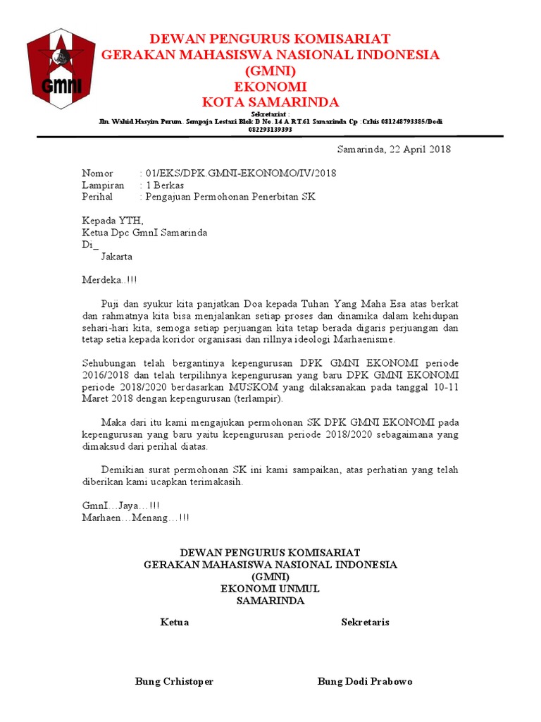 Surat permohonan sendiri dapat bersifat resmi atau pun tidak resmi. Dengan hormat, dengan ini kami mengajukan permohonan untuk diterbitkan sk (surat keputusan) tentang susunan pengurus majelis pembimbing dan pembina gugus depan yang berpangkalan di man 2 ketapang kecamatan matan. Demikianlah surat ini kami sampaikan, atas perhatian dan kerjasamanya kami ucapkan terima kasih. Agar permohonan tersebut dikabulkan maka kita. Contoh surat permohonan sk susunan pengurus.